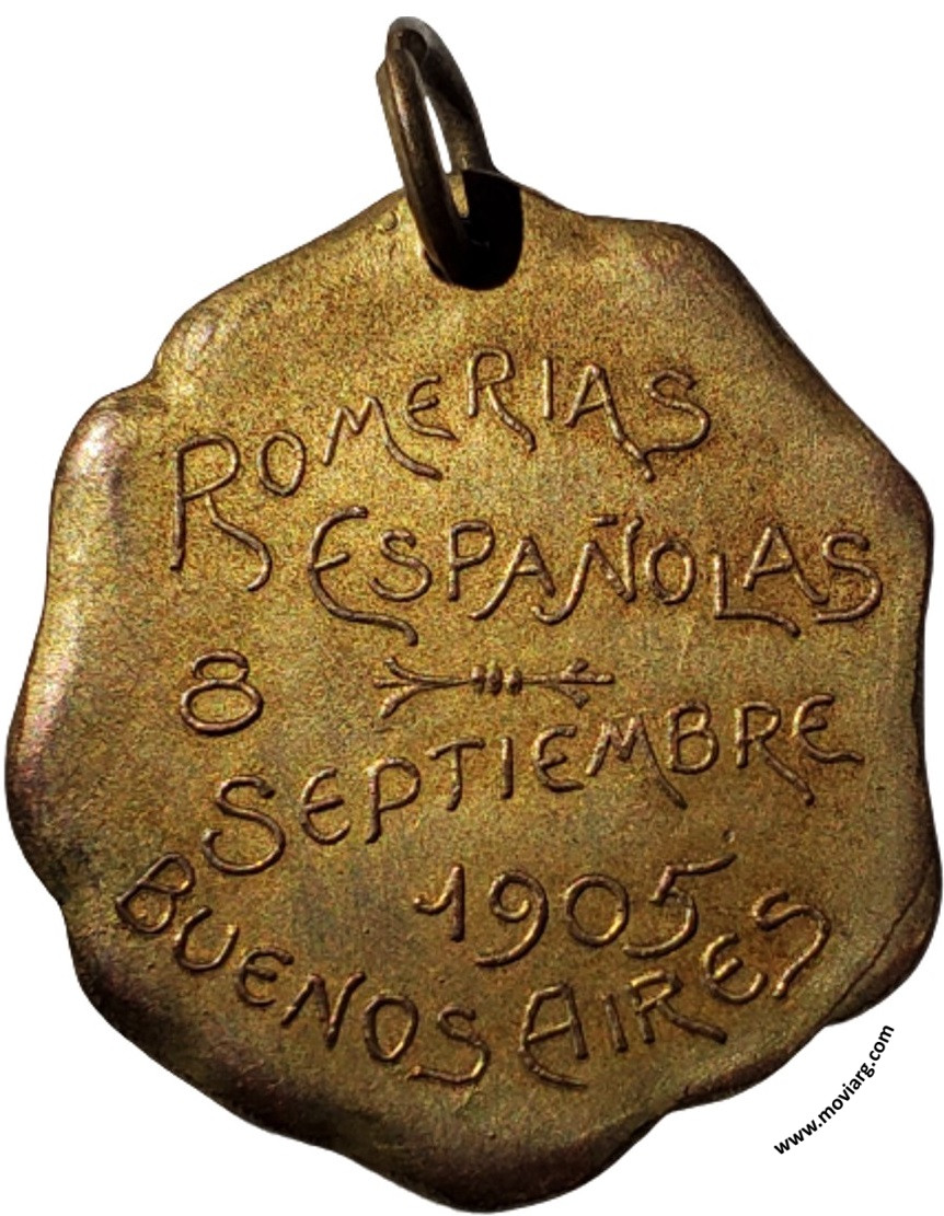 | Año: 1905 Romerías Metal: Dorado - Peso: 8.14gr - Módulo: 26.69x29.75mm - Espesor: 1.62mm - Rotación: 12hrs Grabador: Juan Gottuzzo | |
