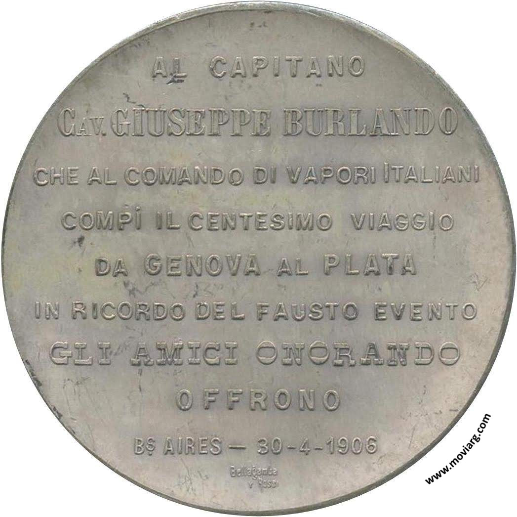 Anverso: Firma: F. GALANTE Reverso: AL CAPITANO / CAV. GIUSEPPE BURLANDO / CHE AL COMANDO DI VAPORI ITALIANI / COMPÍ IL CENTESIMO VIAGGIO / DA GENOVA AL PLATA / IN RICORDO DEL FAUSTO EVENTO / GLI AMICI ONORANDO / OFFRONO / BS. AIRES - 30 - 4 - 1906. Firma: BELLAGAMBA / Y ROSSI Canto: Humberto Burzio: "Buenos Aires en la medalla" 1981 p261. Referencia: BURZIO-758 | |