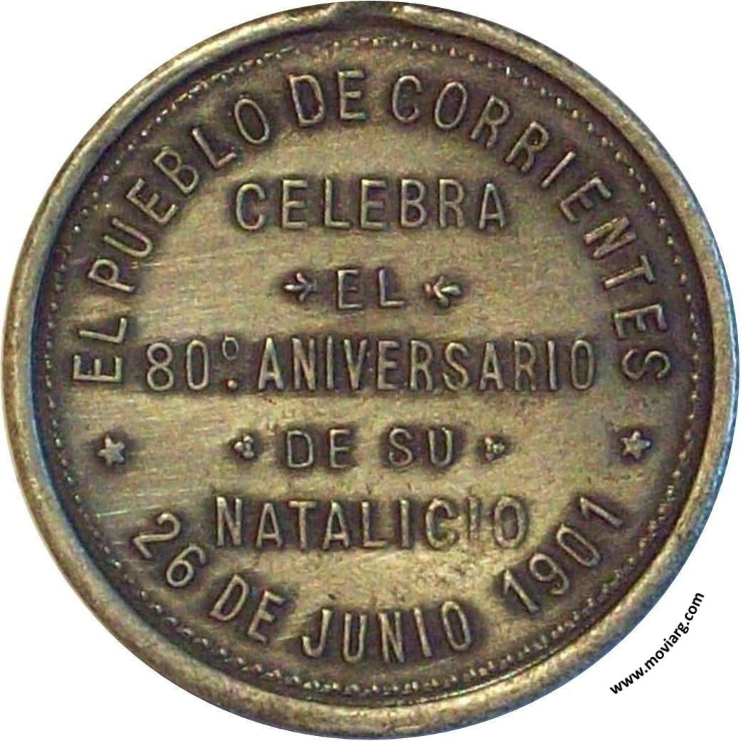 Anverso: BARTOLOME MITRE. Firma: B. Y R. Reverso: EL PUEBLO DE CORRIENTES / CELEBRA / EL / 80° ANIVERSARIO / DE SU / NATALICIO / 26 DE JUNIO 1901 Referencia: ROSA-21 (M80) | |