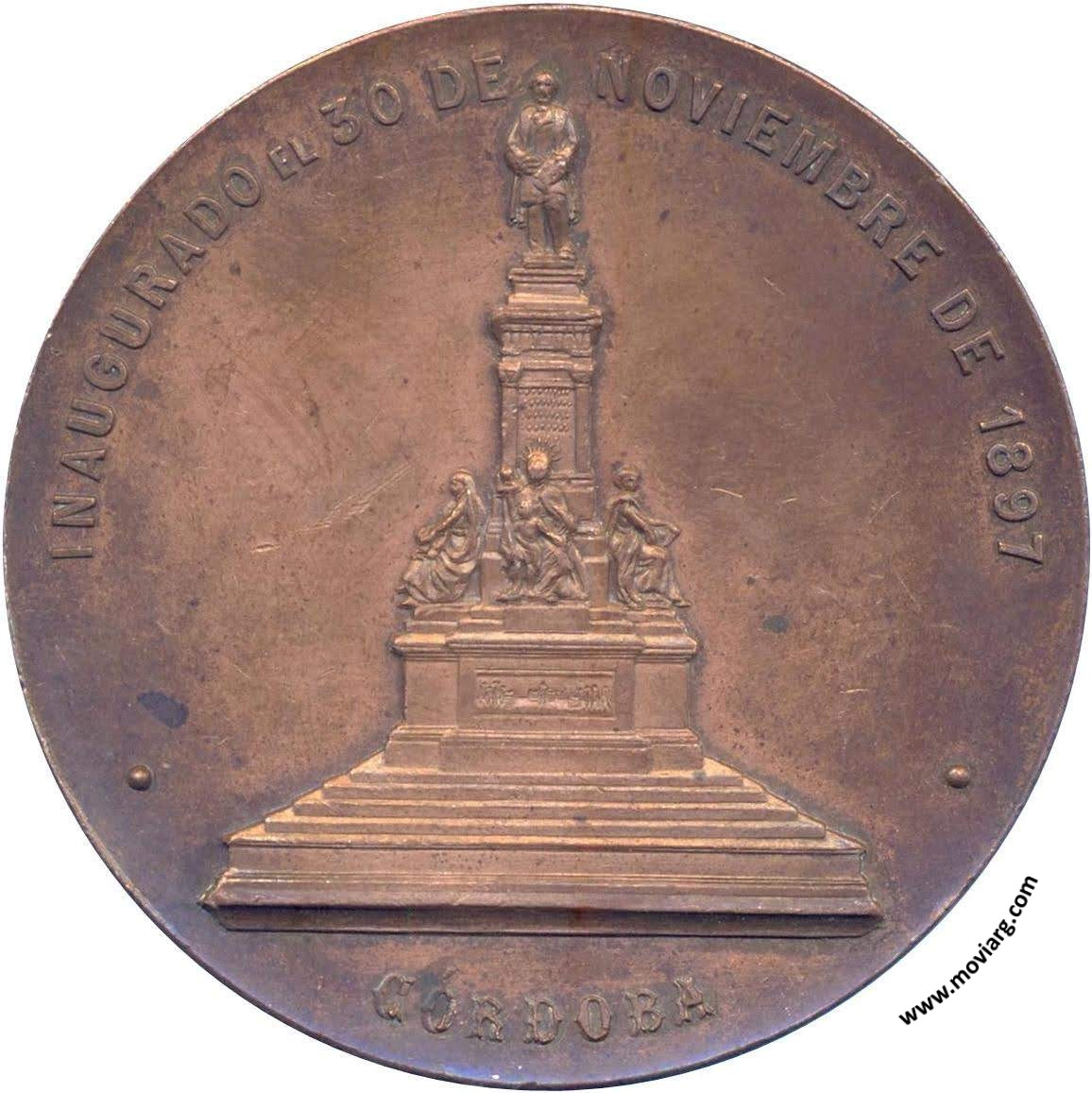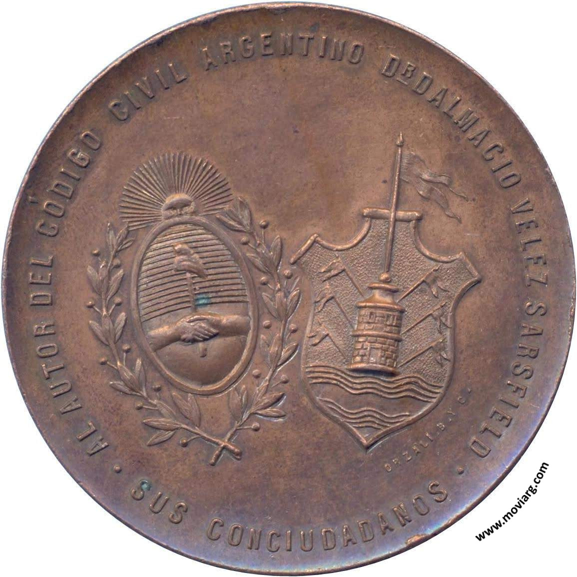 Anverso: AL AUTOR DEL CÓDIGO CIVIL ARGENTINO DR. DALMACIO VELEZ SARSFIELD / SUS CUIDADANOS. Firma: ORZALI. B. Y C. Reverso: INAUGURADO EL 30 DE NOVIEMBRE DE 1897 / CÓRDOBA Referencia: | |