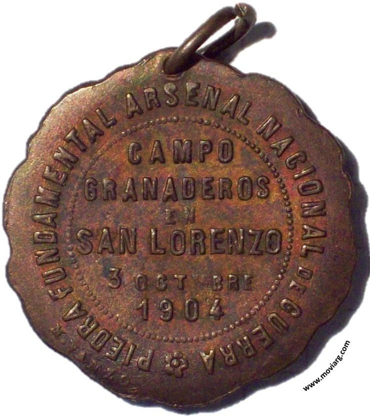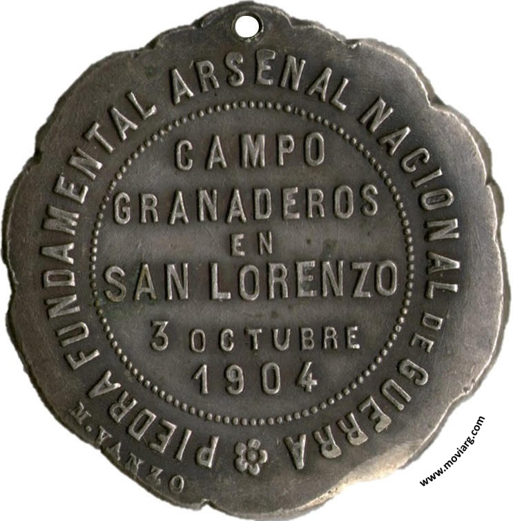 Anverso: J. A. ROCA - R. FREYRE - P. RICCHERI Reverso: PIEDRA FUNDAMENTAL ARSENAL NACIONAL DE GUERRA / CAMPO / GRANADEROS / EN / SAN LORENZO / 3 OCTUBRE / 1904. Firma: M. VANZO Referencia: | |
