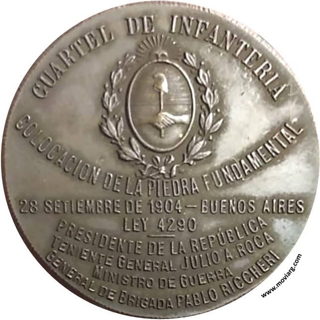 Anverso: Firma: BELLAGAMBA / Y ROSSI Reverso: CUARTEL DE INFANTERIA / COLOCACION DE LA PIEDRA FUNDAMENTAL / 28 SETIEMBRE DE 1904 - BUENOS AIRES / LEY 4290 / PRESIDENTE DE LA REPÚBLICA / TENIENTE GENERAL JULIO A. ROCA / MINISTRO DE GUERRA / GENERAL DE BRIGADA PABLO RICCHERI Referencia: | |