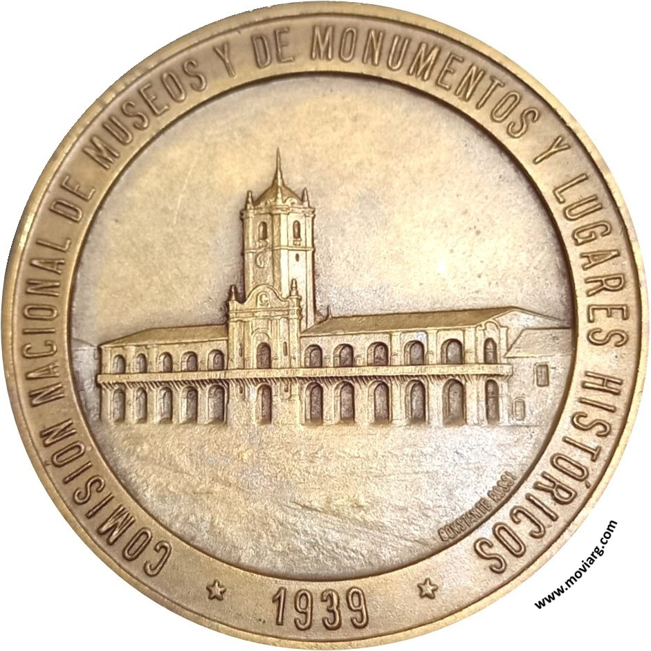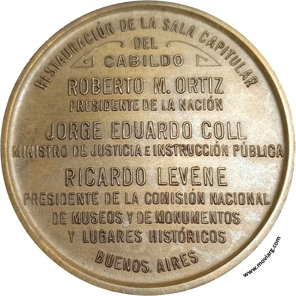 Anverso: COMISIÓN NACIONAL DE MUSEOS Y DE MONUMENTOS Y LUGARES HISTÓRICOS / 1939. Firma: CONSTANTE ROSSI Reverso: RESTAURACIÓN DE LA SALA CAPITULAR / DEL / CABILDO / ROBERTO M. ORTIZ / PRESIDENTE DE LA NACIÓN / JORGE EDUARDO COLL / MINISTRO DE JUSTICIA E INSTRUCCIÓN PÚBLICA / RICARDO LEVENE / PRESIDENTE DE LA COMISIÓN NACIONAL / DE MUSEOS Y DE MONUMENTOS / Y LUGARES HISTÓRICOS / BUENOS AIRES Referencia: | |