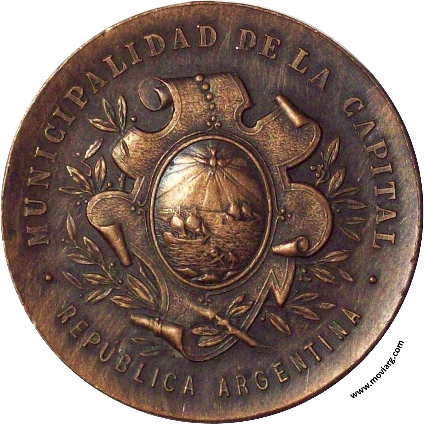 | Año: 1901 Obras y Servicios Públicos Metal: Cobre - Peso: 16.4gr - Módulo: 38mm Grabador: José Bellagamba y Constante Rossi | |