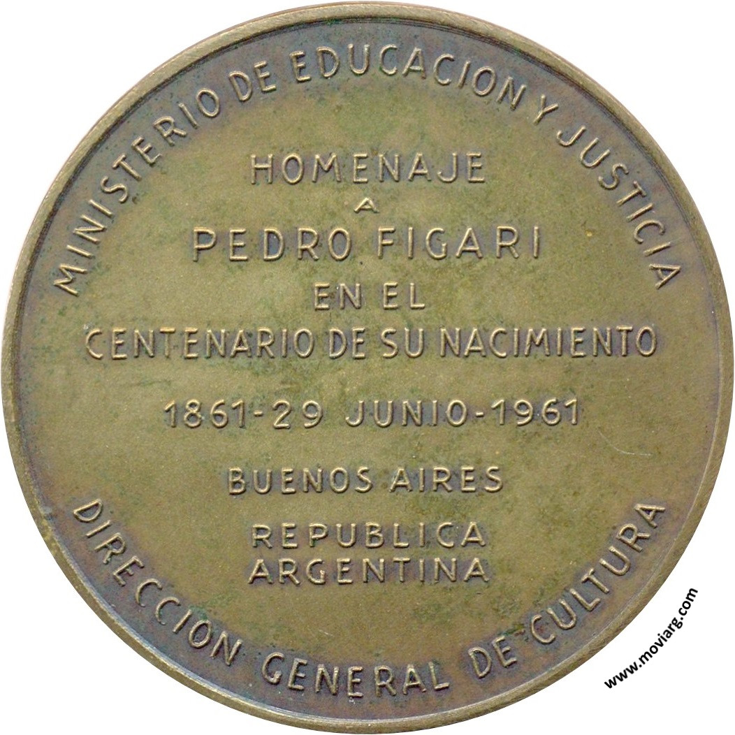Anverso: PEDRO FIGARI / 1861 / 1938. Firma: JOSE FIORAVANTI / A.N.A. Reverso: MINISTERIO DE EDUCACION Y JUSTICIA / HOMENAJE / A / PEDRO FIGARI / EN EL / CENTENARIO DE SU NACIMIENTO / 1861 - 29 JUNIO - 1961 / BUENOS AIRES / REPUBLICA / ARGENTINA / DIRECCION GENERAL DE CULTURA Referencia: | |