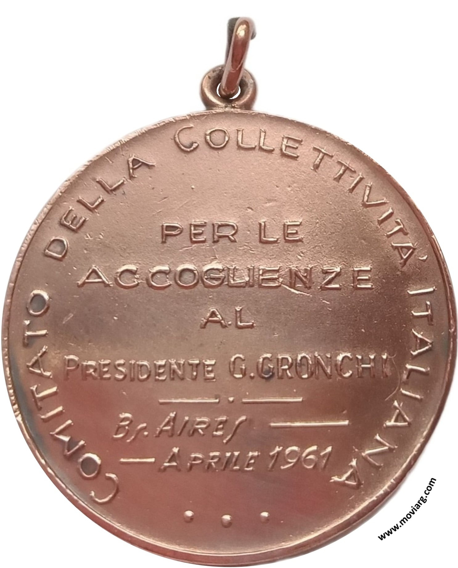 Anverso: GIOVANNI GRONCHI Reverso: COMITATO DELLA COLLETTIVITA ITALIANA / PER LE / ACCOGLIENZE / AL / PRESIDENTE G. GRONCHI / BS. AIRES / APRILE 1961 Referencia: | |