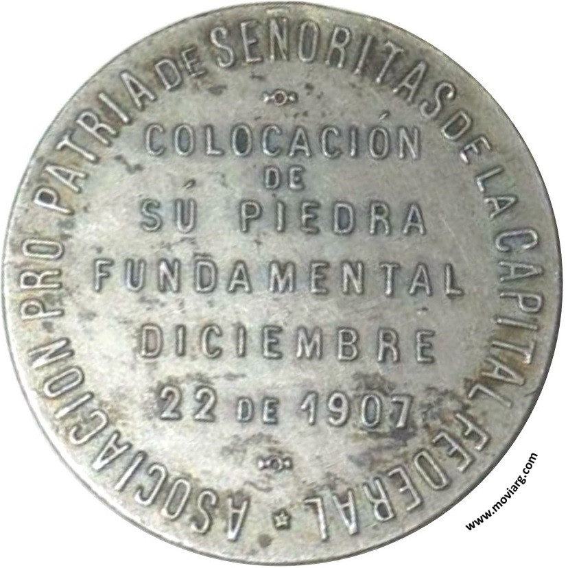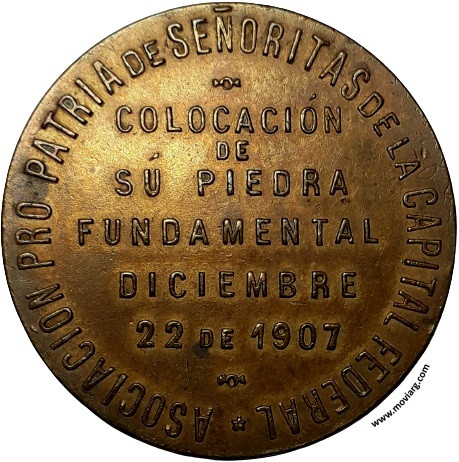 Anverso: MONUMENTO A LAS PATRICIAS ARGENTINAS. Firma: LOLA MORA Reverso: ASOCIACION PRO PATRIA DE SEÑORITAS DE LA CAPITAL FEDERAL / COLOCACIÓN / DE / SÚ PIEDRA / FUNDAMENTAL / DICIEMBRE / 22 DE 1907 Referencia: | |