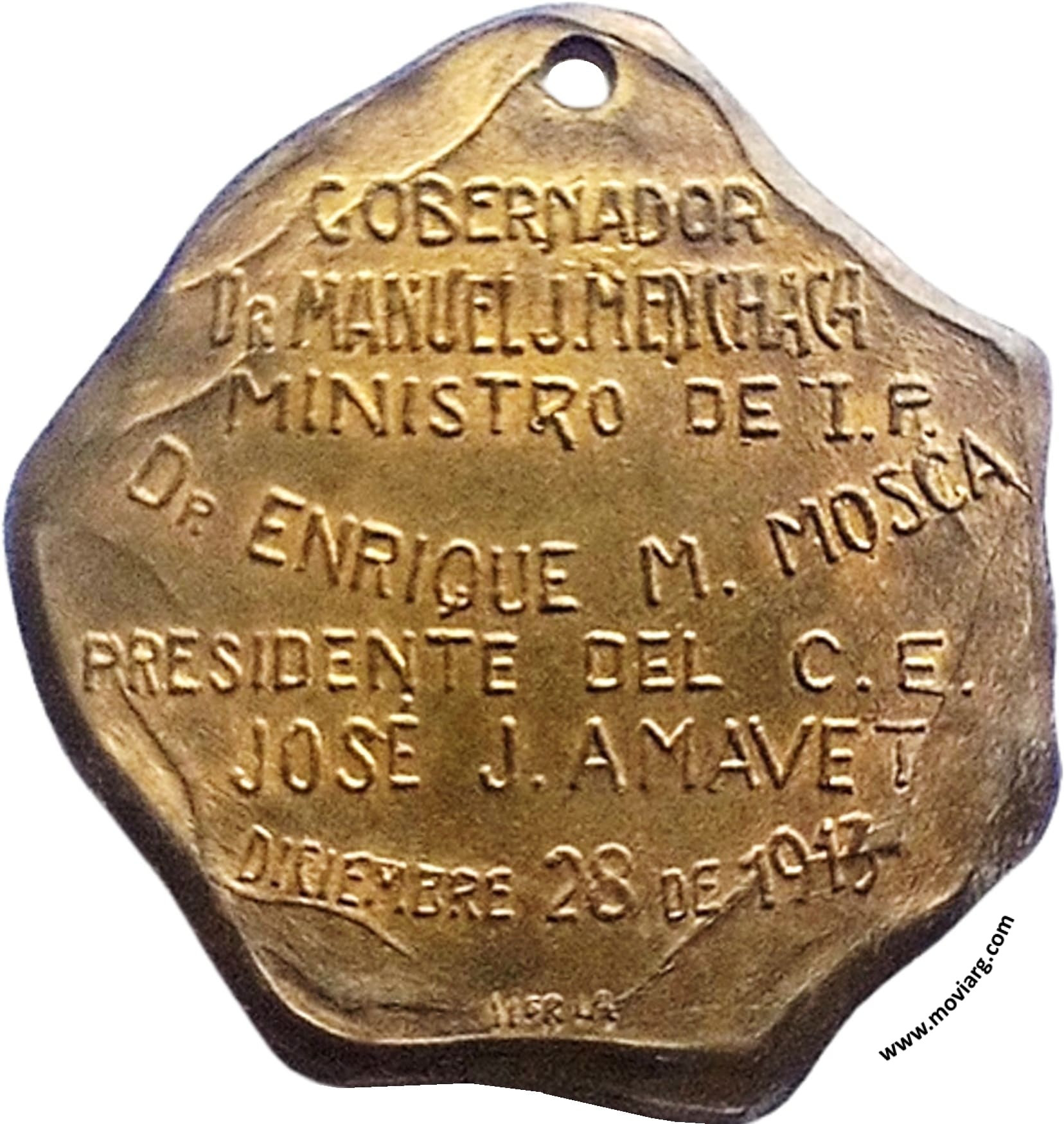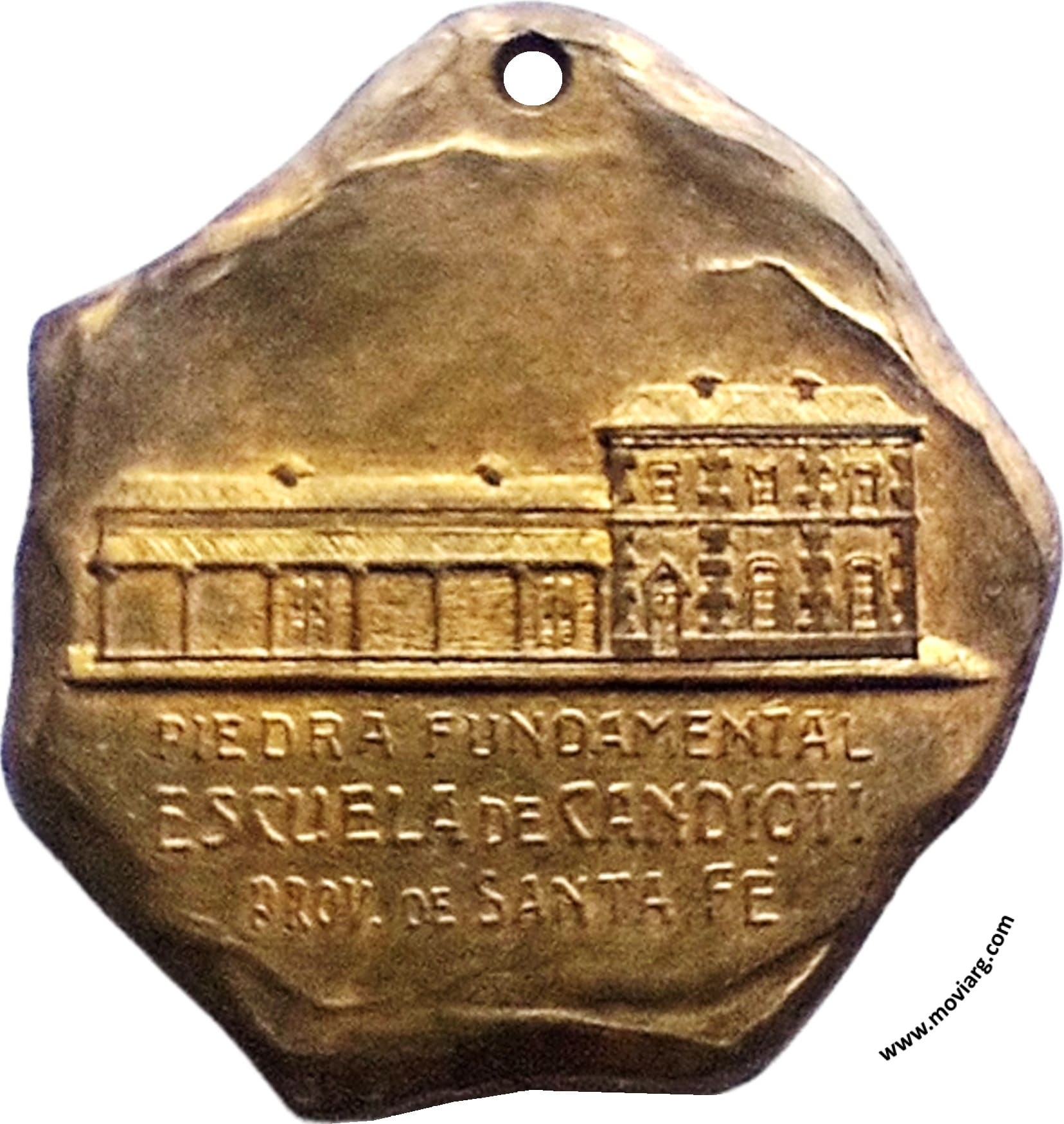 Anverso: PIEDRA FUNDAMENTAL / ESCUELA DE CANDIOTI / PROV. DE SANTA FÉ Reverso: GOBERNADOR / DR. MANUEL J. MENCHACA / MINISTRO DE I. P. / DR. ENRIQUE M. MOSCA / PRESIDENTE DEL C. E. / JOSÉ J. AMAVET / DICIEMBRE 28 DE 1913. Firma: HORTA Referencia: | |
