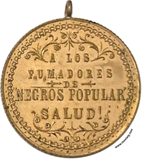 Anverso: JUAN POSSE Y CA. BUENOS AIRES / RIVADAVIA 1122 Reverso: A LOS / FUMADORES / DE / " NEGROS POPULAR " / SALUD ! Canto: Estriado Recto Referencia: | |