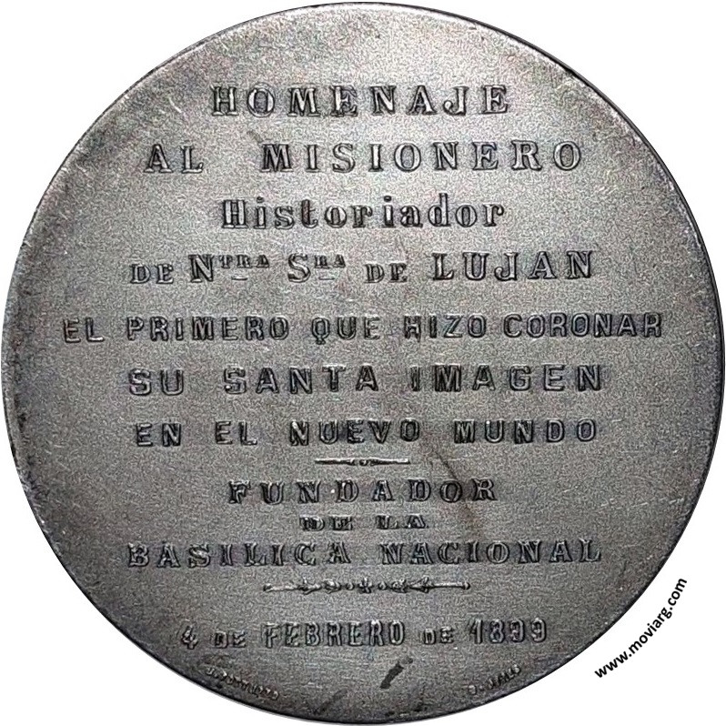Anverso: JORGE M. SALVAIRE. Firma: ??? Reverso: HOMENAJE / AL MISIONERO / HISTORIADOR / DE NTRA. STRA. DE LUJAN / EL PRIMERO QUE HIZO CORONAR / SU SANTA IMAGEN / EN EL NUEVO MUNDO / FUNDADOR / DE LA / BASILICA NACIONAL / 4 DE FEBRERO DE 1899. Firma: J. GOTTUZZO / B. AIRES Referencia: | |