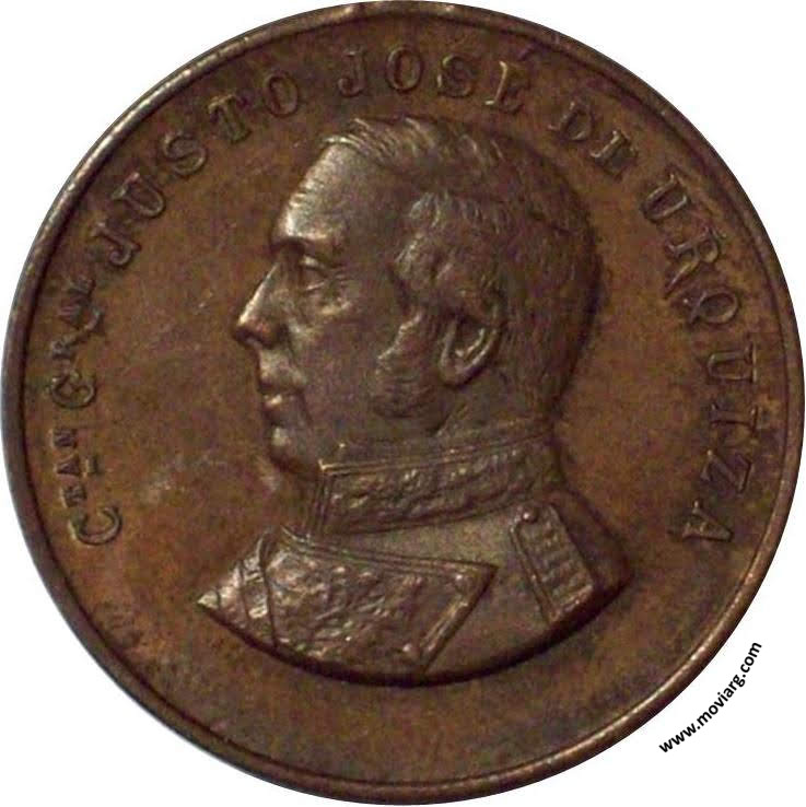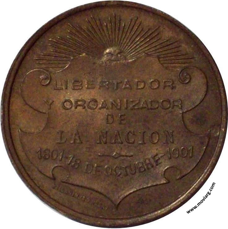 Anverso: CTAN. GRAL. JUSTO JOSÉ DE URQUIZA Reverso: LIBERTADOR / Y ORGANIZADOR / DE / LA NACION / 1801 - 18 DE OCTUBRE - 1901. Firma: BELLAGAMBA Y ROSSI Referencia: BURZIO-85 | |