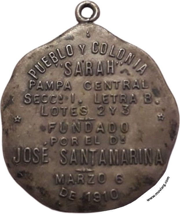 Colección Daniel Paez Anverso:Reverso: PUEBLO Y COLONIA / " SARAH " / PAMPA CENTRAL / SECCN. 1. LETRA B. / LOTES 2 Y 3 / FUNDADO / POR EL DR. / JOSÉ SANTAMARINA / MARZO 6 / DE 1910 Referencia: | |