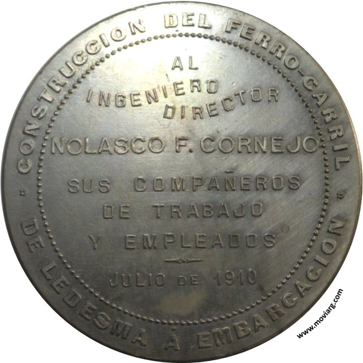 Anverso: Firma: J. GOTTUZZO Y CA. Reverso: CONSTRUCCION DEL FERRO-CARRIL / DE LEDESMA Á EMBARCACION / AL / INGENIERO / DIRECTOR / NOLASCO F. CORNEJO / SUS COMPAÑEROS / DE TRABAJO / Y EMPLEADOS / JULIO DE 1910 Referencia: | |