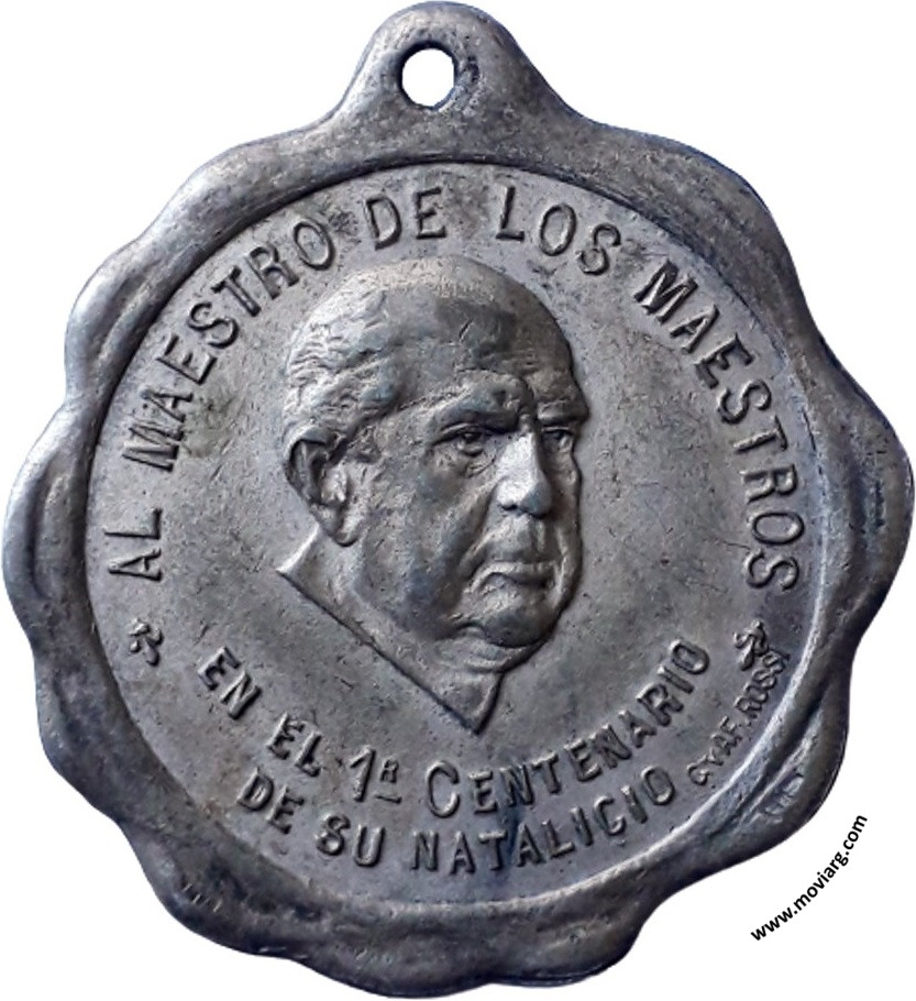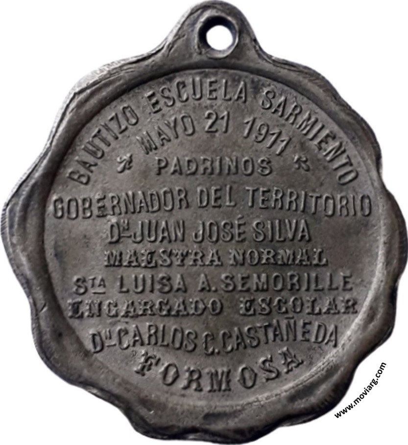 Colección MDS Anverso: AL MAESTRO DE LOS MAESTROS / EN EL 1R. CENTENARIO / DE SU NATALICIO. Firma: C. Y AF. ROSSIReverso: BAUTIZO ESCUELA SARMIENTO / MAYO 21 1911 / PADRINOS / GOBERNADOR DEL TERRITORIO / DN. JUAN JOSÉ SILVA / MAESTRA NORMAL / STA. LUISA A. SEMORILLE / ENCARGADO ESCOLAR / DN. CARLOS C. CASTAÑEDA / FORMOSA Referencia: | |