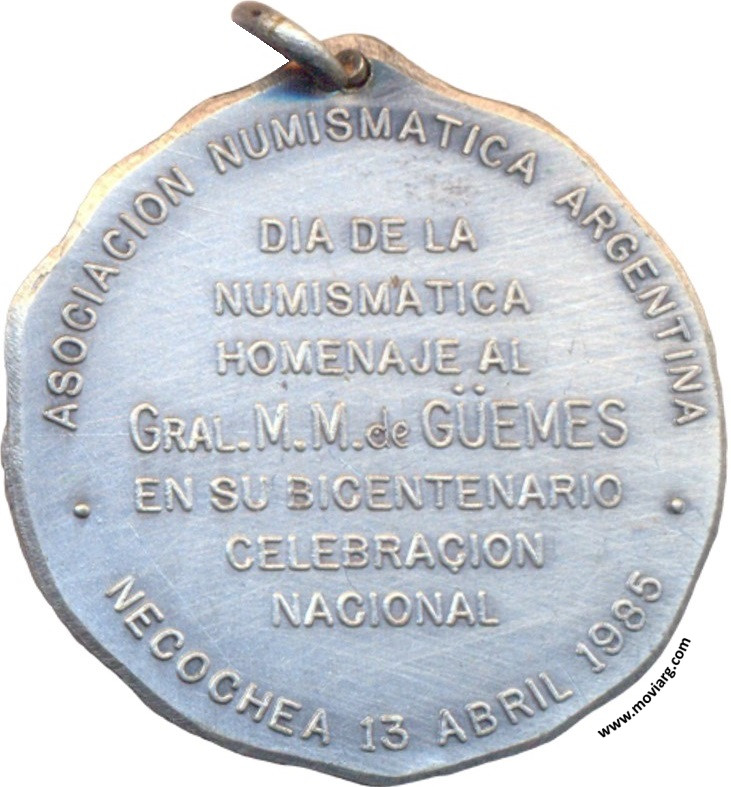 Anverso: Reverso: ASOCIACION NUMISMATICA ARGENTINA / DIA DE LA / NUMISMATICA / HOMENAJE AL / GRAL. M. M. DE GÜEMES / EN SU BICENTENARIO / CELEBRACION / NACIONAL / NECOCHEA 13 ABRIL 1985 Referencia: | |