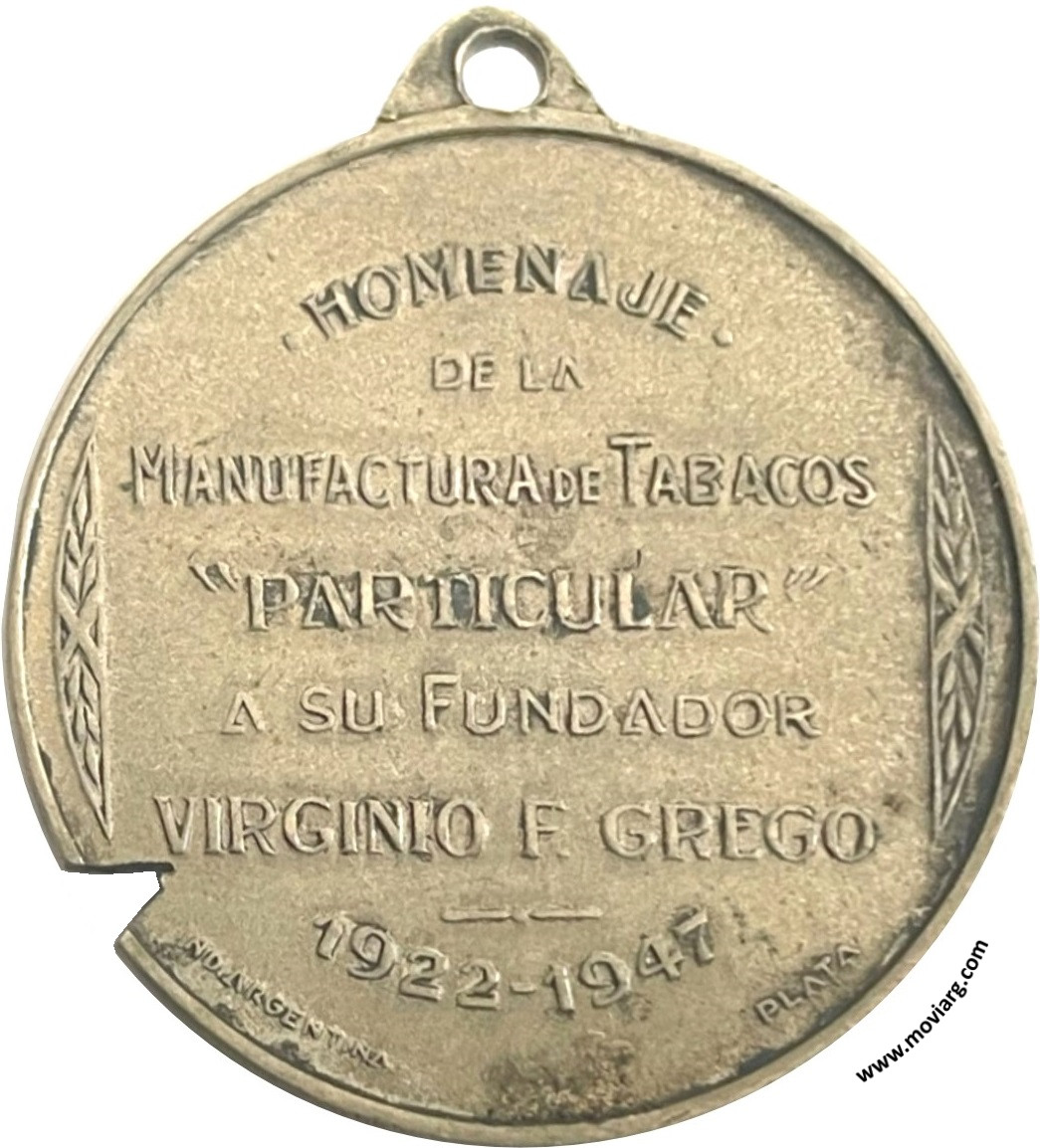 Anverso: Reverso: HOMENAJE / DE LA / MANUFACTURA DE TABACOS / " PARTICULAR " / A SU FUNDADOR / VIRGINIO F. GREGO / 1922 - 1947. Campo: IND. ARGENTINA / PLATA Referencia: | |