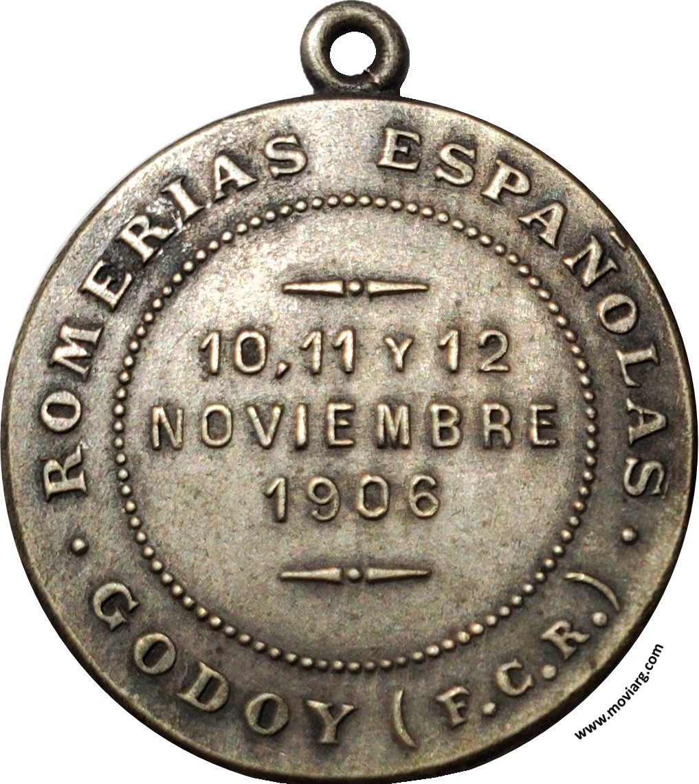Anverso: ALFONSO / XIII / VICTORIA. Campo: 31 MAYO 1906 Reverso: ROMERIAS ESPAÑOLAS / GODOY ( F.C.R. ) / 10, 11 Y 12 / NOVIEMBRE / 1906 Referencia: | |