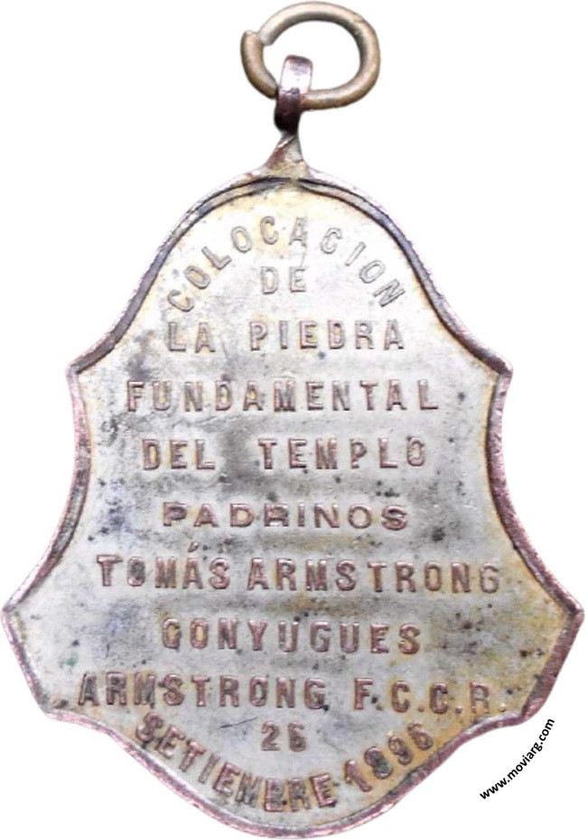 Anverso: SANTO TOMAS DE AQUINO. Firma: ORZALI B. Y C. Reverso: COLOCACION / DE / LA PIEDRA / FUNDAMENTAL / DEL TEMPLO / PADRINOS / TOMÁS ARMSTRONG / CONYUGES / ARMSTRONG F.C.C.R. / 26 / SETIEMBRE 1896 Referencia: | |