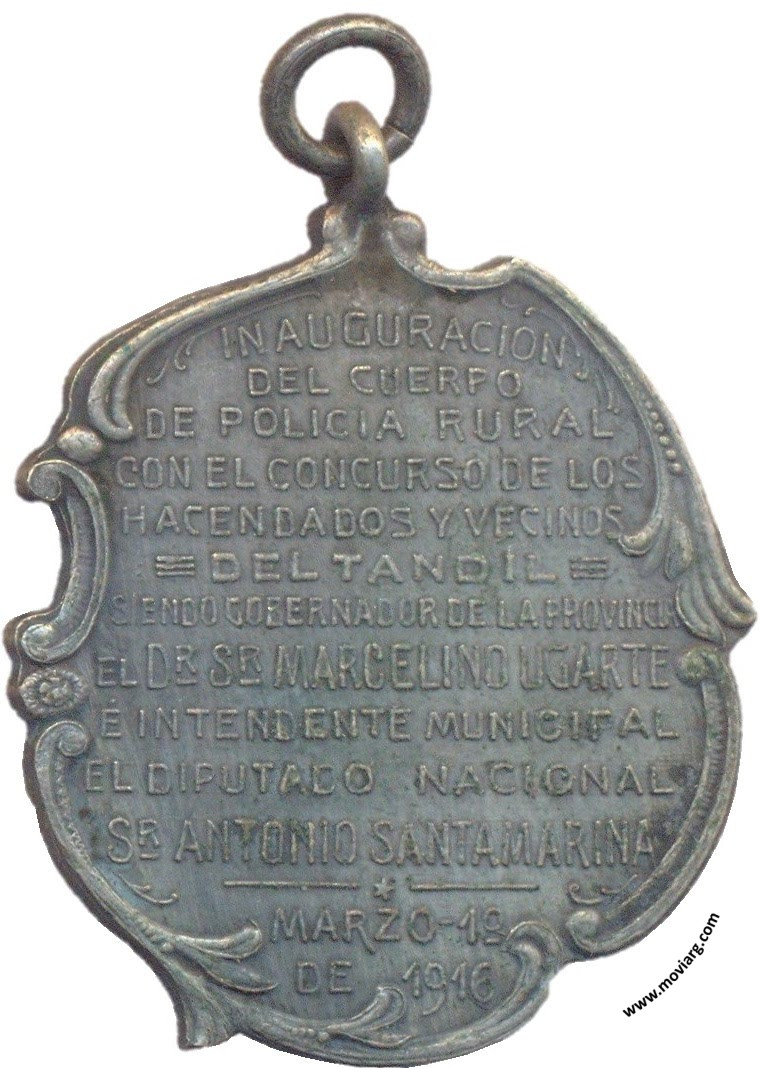Anverso: LUIS M. DOYHERNARD / JEFE DE POLICIA. Firma: HORTA Reverso: INAUGURACIÓN / DEL CUERPO / DE POLICIA RURAL / CON EL CONCURSO DE LOS / HACENDADOS Y VECINOS / DEL TANDIL / SIENDO GOBERNADOR DE LA PROVINCIA / EL DR. SR. MARCELINO UGARTE / É INTENDENTE MUNICIPAL / EL DIPUTADO NACIONAL / SR. ANTONIO SANTAMARINA / MARZO - 1° / DE 1916 Referencia: | |