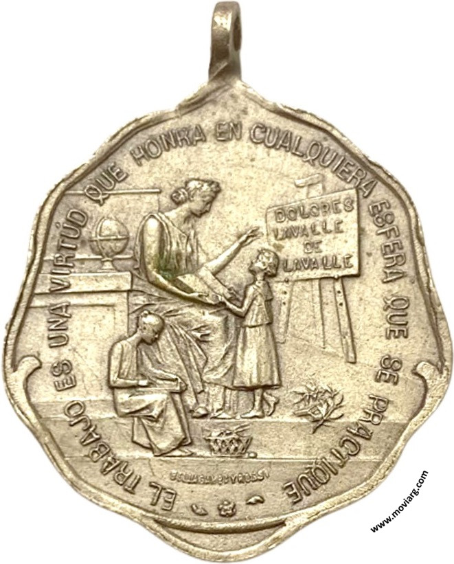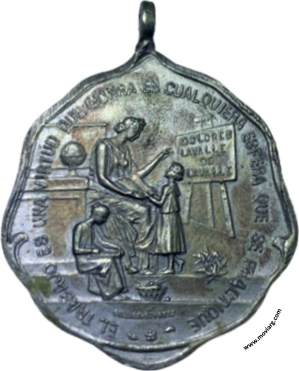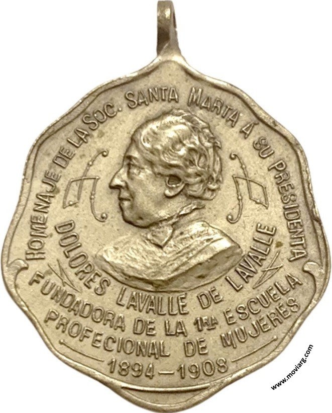 Anverso: EL TRABAJO ES UNA VIRTÚD QUE HONRA EN CUALQUIERA ESFERA QUE SE PRACTIQUE. Campo: DOLORES / LAVALLE / DE / LAVALLE. Firma: BELLAGAMBA Y ROSSI Reverso: HOMENAJE DE LA SOC. SANTA MARIA Á SU PRESIDENTA / DOLORES LAVALLE DE LAVALLE / FUNDADORA DE LA 1RA. ESCUELA / PROFECIONAL (sic) DE MUJERES / 1894 - 1908 Referencia: | |