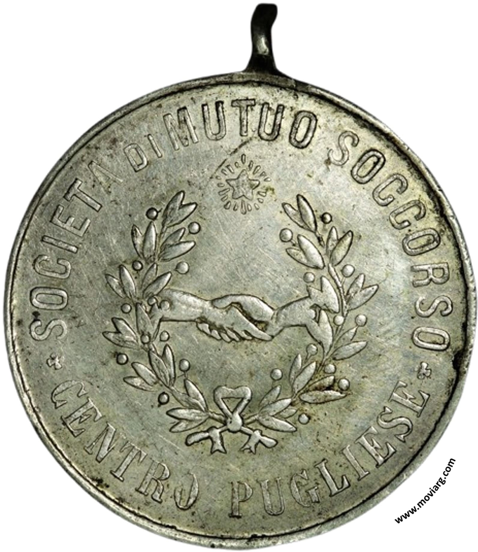 Anverso: SOCIETÁ DI MUTUO SOCCORSO / CENTRO PUGLIESE Reverso: FONDATA IL 1° NOVEMBRE / 1889 / EN LA / BOCA DEL RIACHUELO Referencia: | |