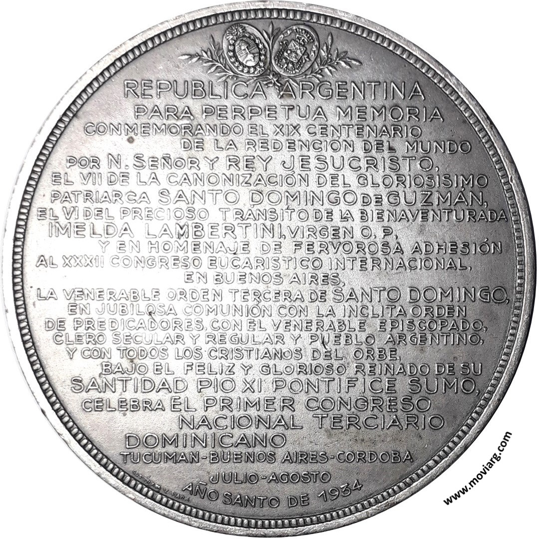 Colección MDS Anverso: MILITES CHRISTI, QUI MACABEOS IN VOS REVIVISCERE FASCITIS - GREGORIUS IX - PONT. MAX - 1227Reverso: REPUBLICA ARGENTINA / PARA PERPETUA MEMORIA / CONMEMORANDO EL XIX CENTENARIO / DE LA REDENCIÓN DEL MUNDO / POR N. SEÑOR Y REY JESUCRISTO, / EL VII DE LA CANONIZACIÓN DEL GLORIOSISIMO / PATRIARCA SANTO DOMINGO DE GUZMÁN, / EL VI DEL PRECIOSO TRÁNSITO DE LA BIENAVENTURADA / IMELDA LAMBERTINI, VIRGEN O. P, / Y EN HOMENAJE DE FERVOROSA ADHESIÓN / AL XXXII CONGRESO EUCARISTICO INTERNACIONAL, / EN BUENOS AIRES, / LA VENERABLE ORDEN TERCERA DE SANTO DOMINGO, / EN JUBILOSA COMUNIÓN CON LA INCLITA ORDEN / DE PREDICADORES, CON EL VENERABLE EPISCOPADO, / CLERO SECULAR Y REGULAR Y PUEBLO ARGENTINO, / Y CON TODOS LOS CRISTIANOS DEL ORBE, / BAJO EL FELIZ Y GLORIOSO REINADO DE SU / SANTIDAD PIO XI PONTIFICE SUMO, / CELEBRA EL PRIMER CONGRESO / NACIONAL TERCIARIO / DOMINICANO / TUCUMAN - BUENOS AIRES - CORDOBA / JULIO - AGOSTO / AÑO SANTO DE 1934. Firma: GOTTUZZO Y PIANA Referencia: | |