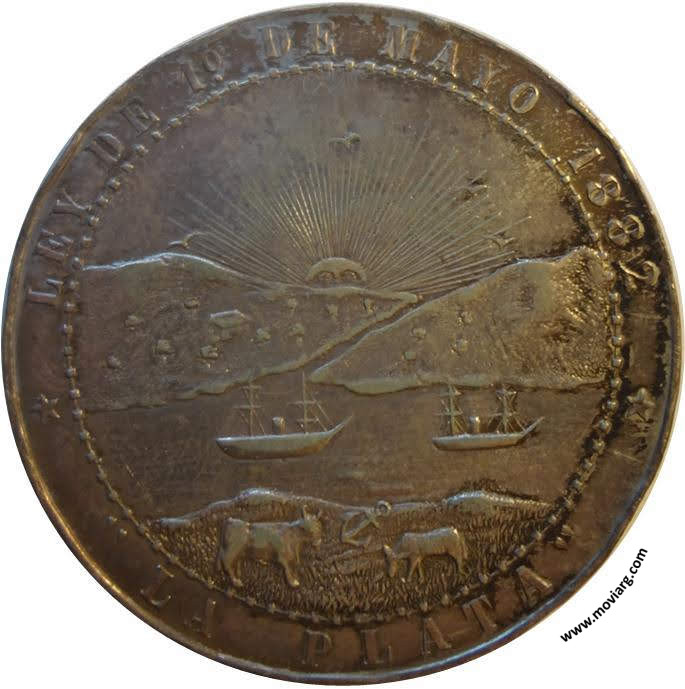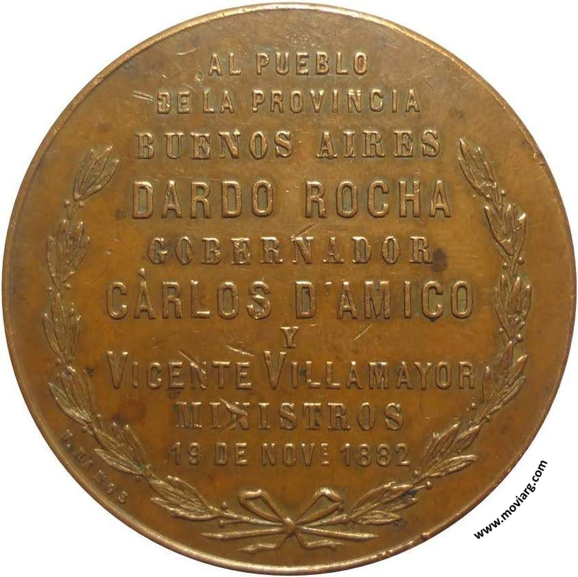 Anverso: LEY DE 1° DE MAYO 1882 / " LA PLATA " Reverso: AL PUEBLO / DE LA PROVINCIA / BUENOS AIRES / DARDO ROCHA / GOBERNADOR / CARLOS D'AMICO / Y / VICENTE VILLAMAYOR / MINISTROS / 19 DE NOV E 1882. Exergo: N. RAMOS Referencia: | |