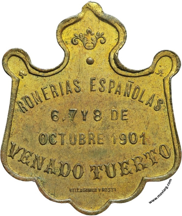 Anverso: Firma: BELLAGAMBA Y ROSSI Reverso: ROMERIAS ESPAÑOLAS / 6, 7 Y 8 DE / OCTUBRE 1901 / VENADO TUERTO. Firma: BELLAGAMBA Y ROSSI Referencia: | |