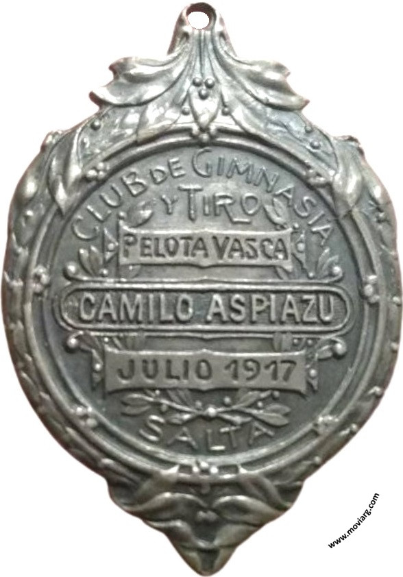 Colección @parryyanumismatico Anverso:Reverso: CLUB DE GIMNASIA / Y TIRO / [ PELOTA VASCA ] / [ CAMILO ASPIAZU ] / [ JULIO 1917 ] / SALTA Referencia: | |