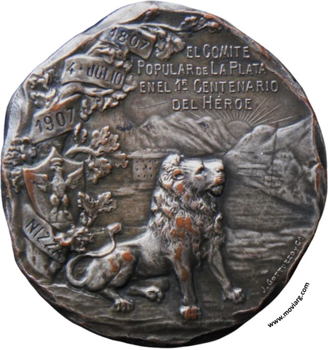 Anverso: GARIBALDI Reverso: EL COMITE / POPULAR DE LA PLATA / EN EL 1R. CENTENARIO / DEL HÉROE. Campo: 1807 / 4 JULIO / 1907 / NIZZA. Firma: J. GOTTUZZO Y CA. Referencia: | |