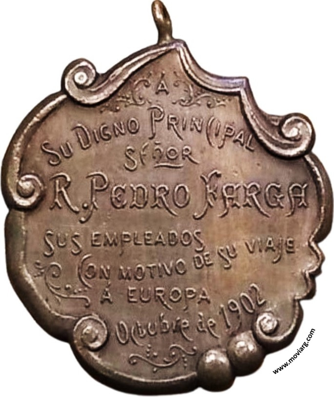 Anverso: Reverso: A / SU DIGNO PRINCIPAL / SEÑOR / R. PEDRO FARGA / SUS EMPLEADOS / CON MOTIVOS DE SU VIAJE / Á EUROPA / OCTUBRE DE 1902 Referencia: | |