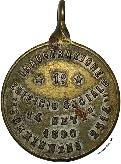 Anverso: "ITALIA" / SOCIETÁ / DI MO. SO. ED INE. / FOND: 18 GENNAIO 1883 Reverso: INAUGURAIONE / 1° / EDIFICIO SOCIALE / 14 SETTE. / 1890 / "CORRIENTES 2314" Referencia: | |