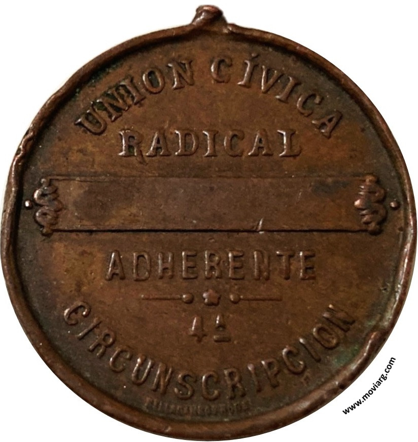 Anverso: LEANDRO N. ALEM Reverso: UNION CÍVICA / RADICAL / ADHERENTE / 4A. / CIRCUNSCRIPCION. Firma: BELLAGAMBA Y ROSSI Referencia: | |