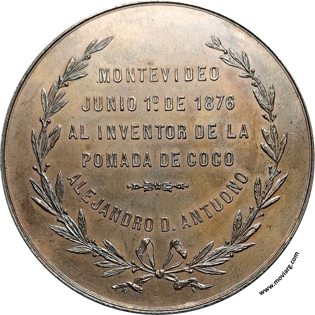 Anverso: Firma: J. DOMINGO Reverso: MONTEVIDEO / JUNIO 1° DE 1876 / AL INVENTOR DE LA / POMADA DE COCO / ALEJANDRO D. ANTUONO Referencia: | |