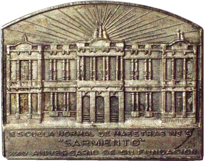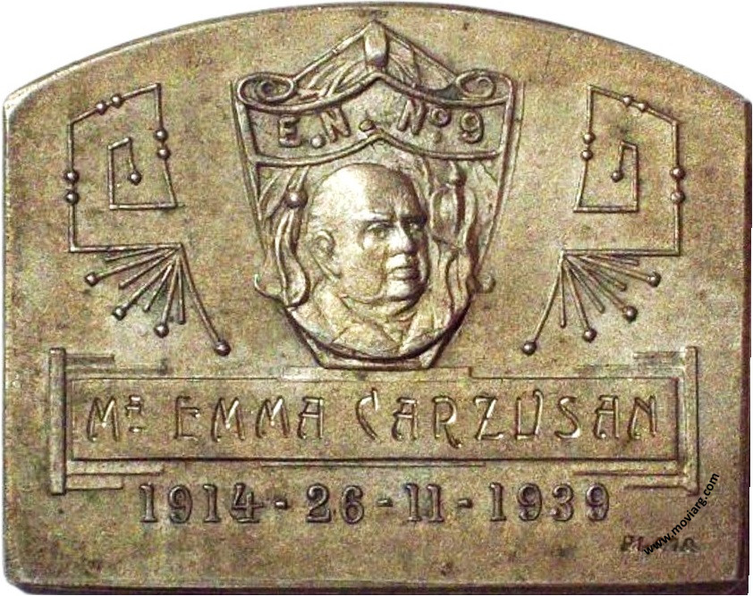 Anverso: ESCUELA NORMAL DE MAESTRAS N°9 / " SARMIENTO " / XXV ANIVERSARIO DE SU FUNDACIÓN Reverso: [ MA. EMMA CARZUSAN ] / 1914 - 26 - 11 - 1939. Campo: [ E. N. N° 9 ]. Exergo: [ PLATA ] Referencia: | |
