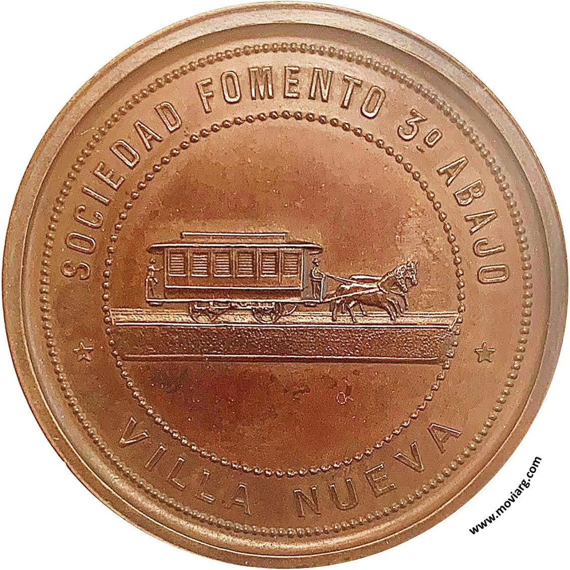 Anverso: SOCIEDAD FOMENTO 3° ABAJO / VILLA NUEVA Reverso: INAUGURACION TRAMWAY OLMOS / 30 AGOSTO 1887 Referencia: | |
