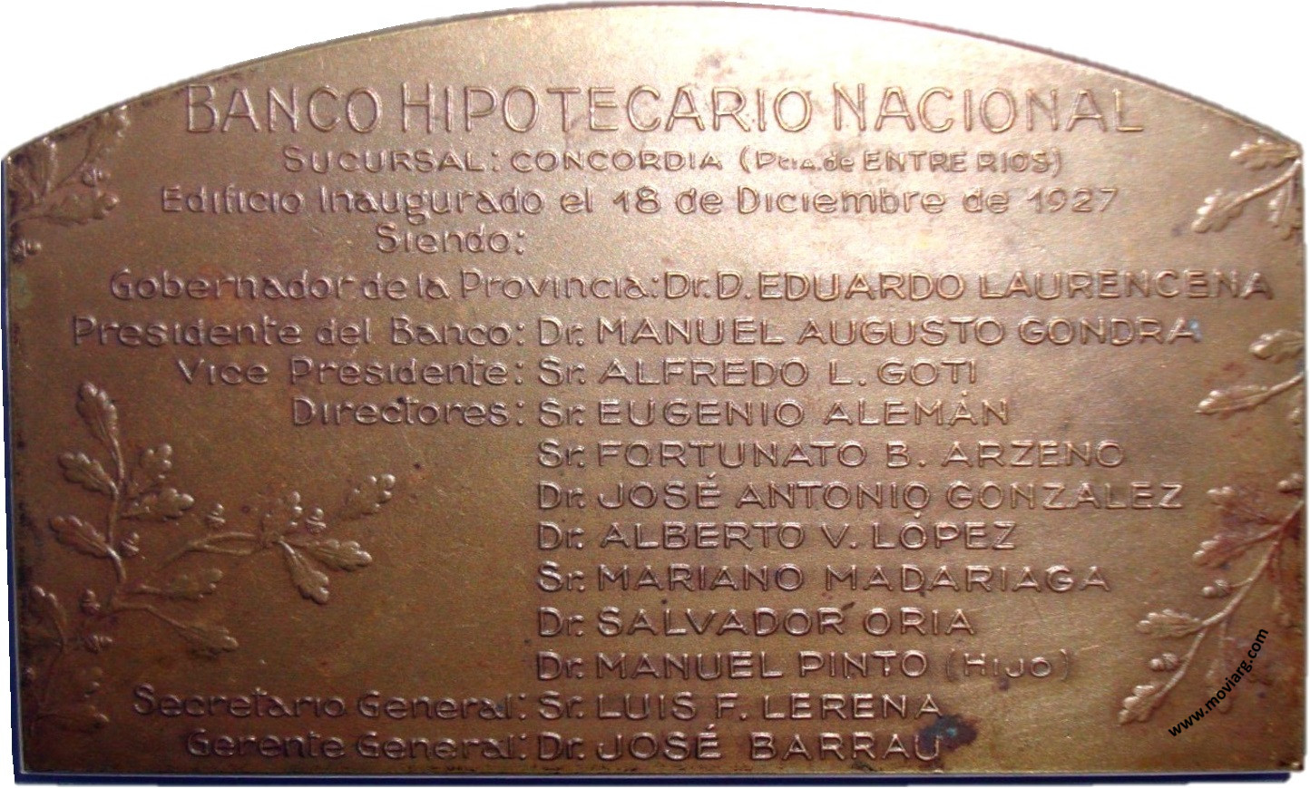 Anverso: Reverso: BANCO HIPOTECARIO NACIONAL / SUCURSAL: CONCORDIA ( PCIA. DE ENTRE RIOS) / EDIFICIO INAUGURADO EL 18 DE DICIEMBRE DE 1927 / SIENDO: / GOBERNADOR DE LA PROVINCIA: DR. D. EDUARDO LAURENCENA / PRESIDENTE DEL BANCO: DR. MANUEL AUGUSTO GONDRA / VICE PRESIDENTE: SR. ALFREDO L. GOTI / DIRECTORES: SR. EUGENIO ALEMÁN / SR. FORTUNATO B. ARZENO / DR. JOSÉ ANTONIO GONZALEZ / DR. ALBERTO V. LÓPEZ / SR. MARIANO MADARIAGA / DR. SALVADOR ORIA / DR. MANUEL PINTO (HIJO) / SECRETARIO GENERAL: SR. LUIS F. LERENA / GERENTE GENERAL: DR. JOSÉ BARRAU Referencia: | |