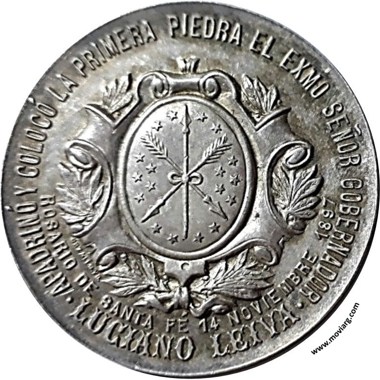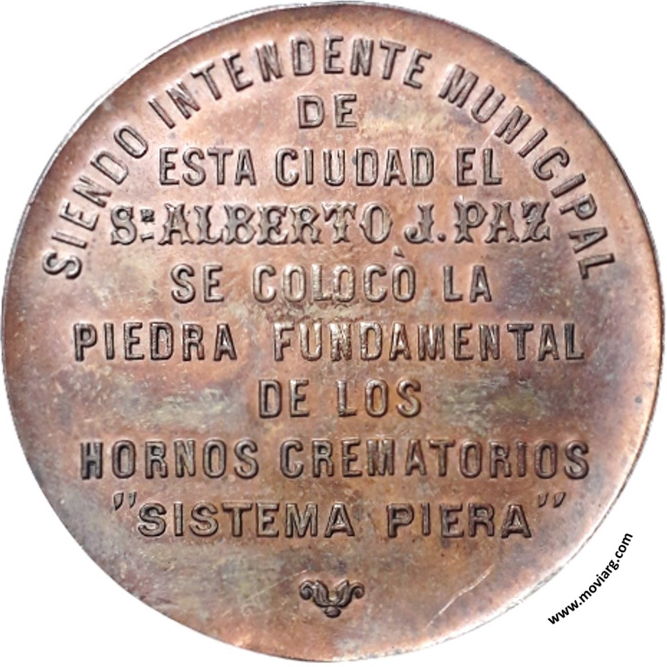 Anverso: APADRINÓ Y COLOCÓ LA PRIMERA PIEDRA EL EXMO. SEÑOR GOBERNADOR / LUCIANO LEIVA / ROSARIO DE SANTA FÉ 14 NOVIEMBRE 1897. Firma: ORZALI B. Y C. Reverso: SIENDO INTENDENTE MUNICIPAL / DE / ESTA CIUDAD EL / SR. ALBERTO J. PAZ / SE COLOCÓ LA / PIEDRA FUNDAMENTAL / DE LOS / HORNOS CREMATORIOS / " SISTEMA PIERA " Referencia: | |