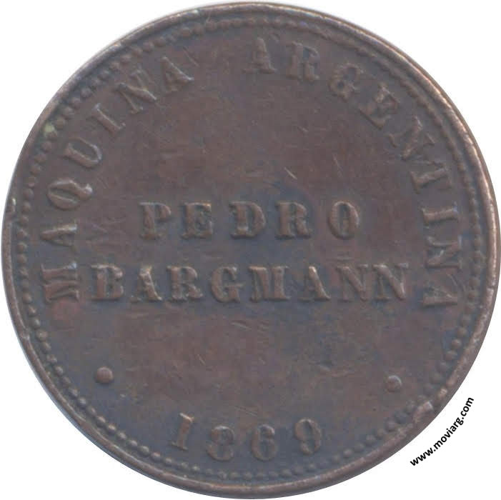 Anverso: MAQUINA ARGENTINA / PEDRO / BARGMANN / 1869 Reverso: SEÑA POR / UN PAN Referencia: | |
