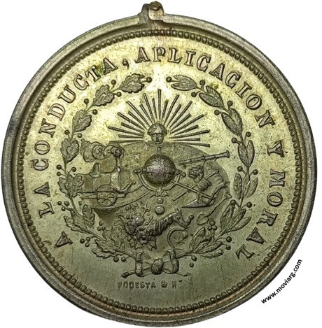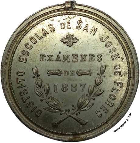 Anverso: A LA CONDUCTA, APLICACION Y MORAL. Firma: PODESTÁ & HO. Reverso: DISTRITO ESCOLAR DE SAN JOSÉ DE FLORES / EXÁMENES / DE / 1887 Referencia: | |