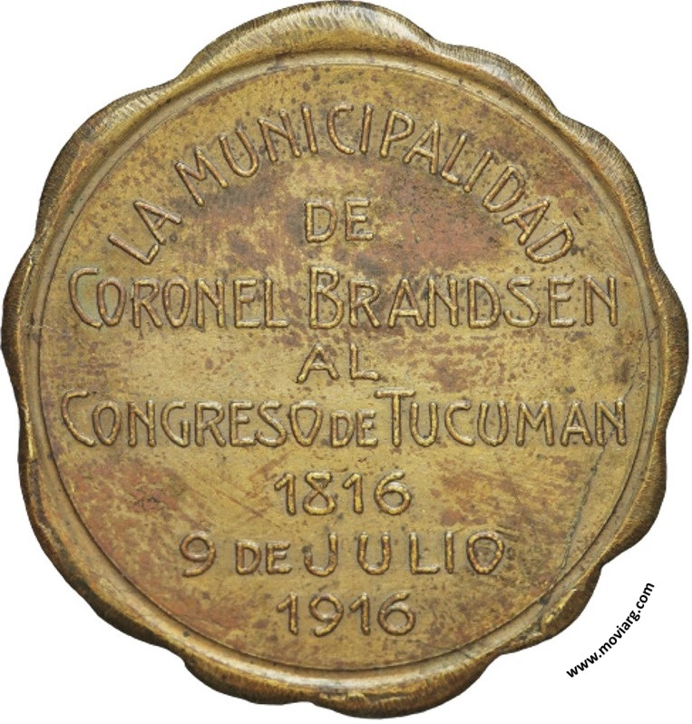 Anverso: Firma: GOTTUZZO Y CA. Reverso: LA MUNICIPALIDAD / DE / CORONEL BRANDSEN / AL / CONGRESO DE TUCUMAN / 1816 / 9 DE JULIO / 1916 Referencia: | |