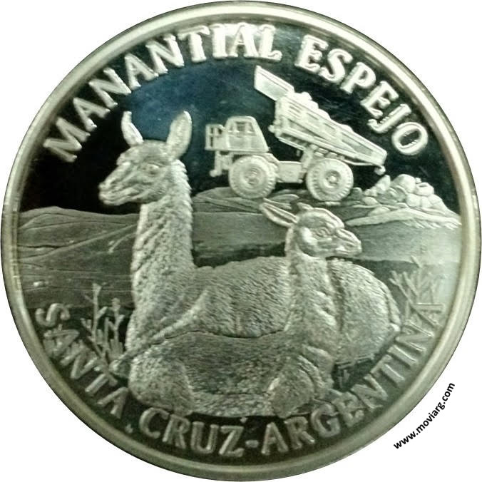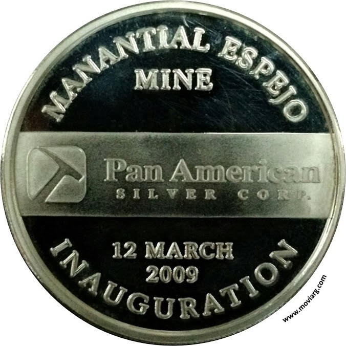 Anverso: MANANTIAL ESPEJO / SANTA CRUZ - ARGENTINA Reverso: MANANTIAL ESPEJO / MINE / 12 MARCH / 2009 / INAUGURATION. Campo: PAN AMERICAN / SILVER CORP. Referencia: | |