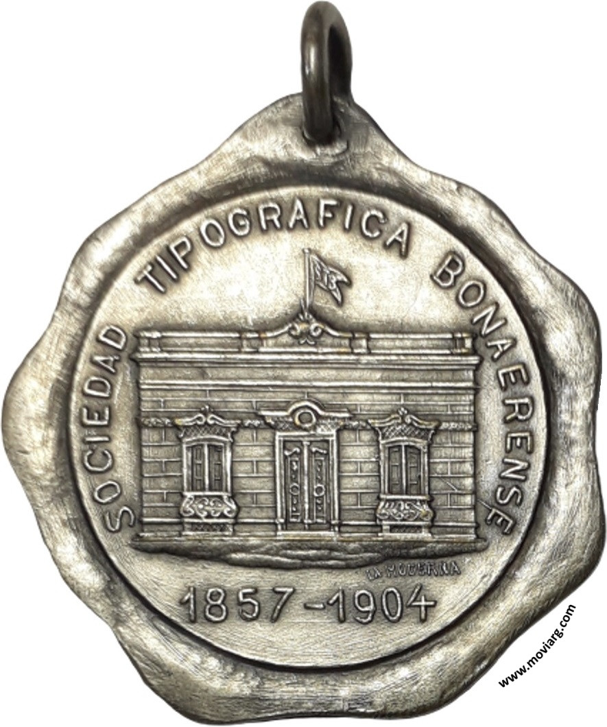 Colección MDS Anverso: SOCIEDAD TIPOGRAFICA BONAERENSE / 1857 - 1904. Firma: LA MODERNA. Campo: S.T.B.Reverso: COLOCACION / DE LA PIEDRA / FUNDAMENTAL / PADRINOS: / JUANA L. DE MARTINEZ / EZEQUIEL PAZ / FEBRERO 7 / DE 1904 Referencia: | |