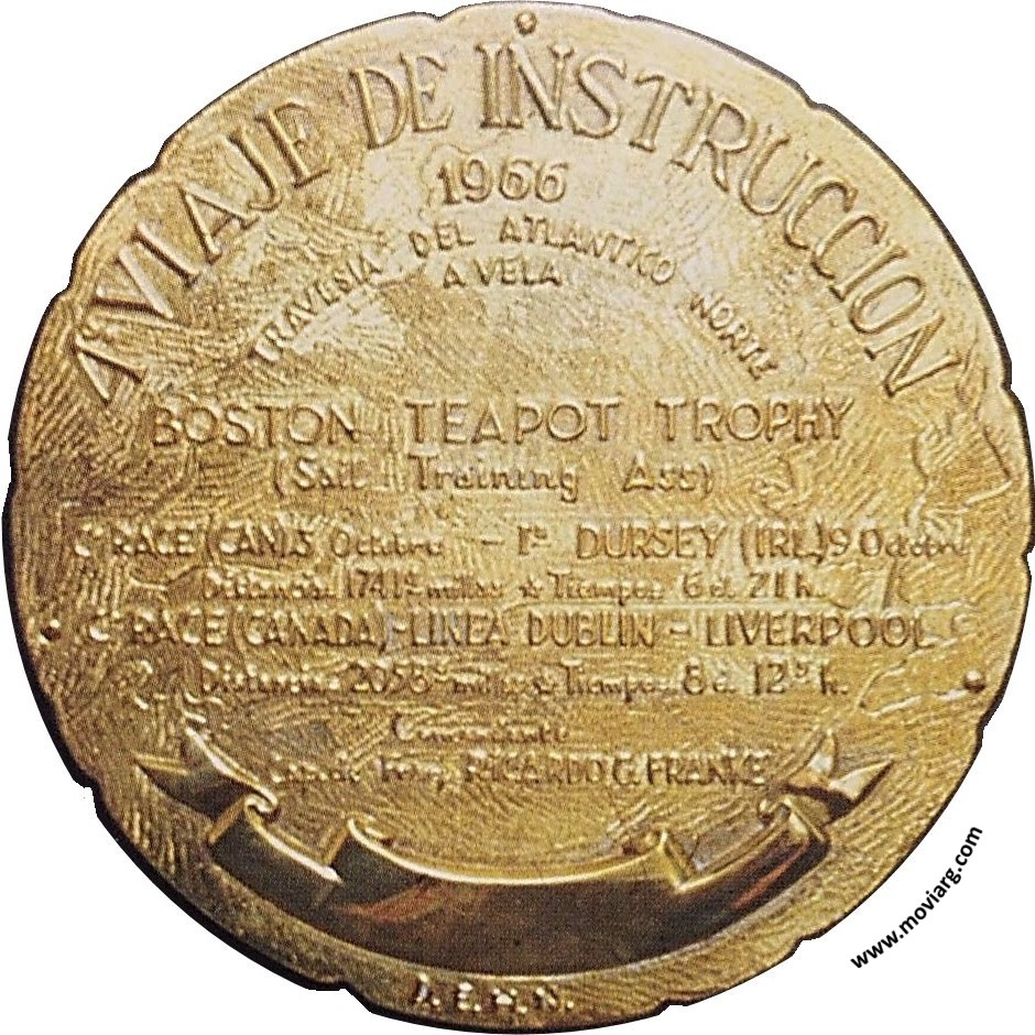 Anverso: ARMADA ARGENTINA / A.R.A. / FRAGATA ESCUELA / LIBERTAD Reverso: 4° VIAJE DE INSTRUCCION / 1966 / TRAVESIA DEL ATLANTICO NORTE / A VELA / BOSTON TEAPOT TROPHY / ( SAIL TRAINING ASS) / C' RACE (CAN) 3 OCTUBRE - 1° DURSEY (IRE) 9 OCTUBRE / DISTANCIA 1741 MILLAS TIEMPO: 6D. 21H. / C' RACE (CANADA - LINEA DUBLIN - LIVERPOOL / DISTANCIA: 2058 MILLAS TIEMPO: 8D 12.5H. / COMANDANTE: CAP. DE FRAG. RICARDO G. FRANICE (???). Firma: D.E.H.N. Referencia: | |