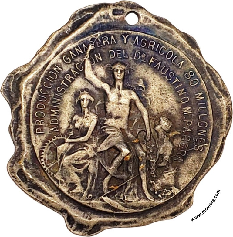 Anverso: PRODUCCION GANADERA Y AGRÍCOLA 80 MILLONES / ADMINISTRACION DEL DR. FAUSTINO M. PARERA Reverso: EXPOSICION DE / ENTRE RIOS EN BUENOS AIRES 1910. Firma: C. Y AF. ROSSI Referencia: | |