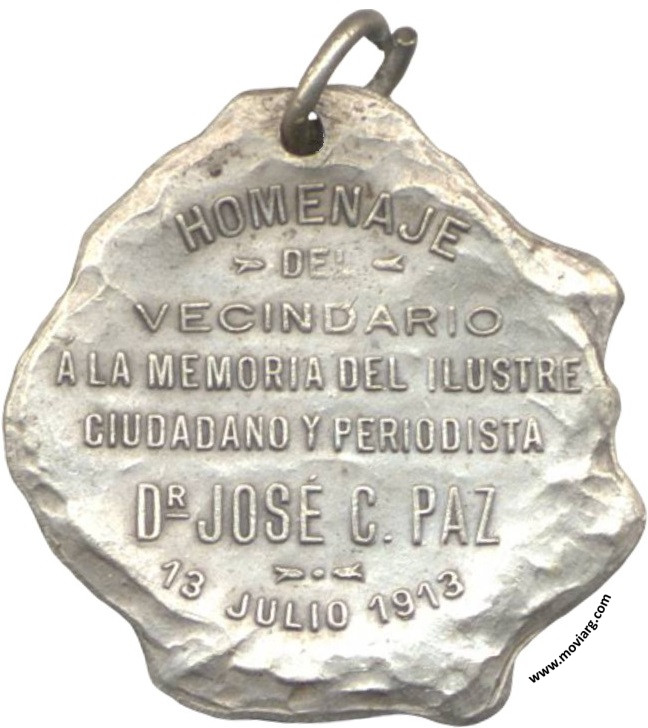 Anverso: ESTACIÓN / " JOSÉ C. PAZ ". Firma: C. Y AF. ROSSI Reverso: HOMENAJE / DEL / VECINDARIO / Á LA MEMORIA DEL ILUSTRE / CIUDADANO Y PERIODISTA / DR. JOSÉ C. PAZ / 13 JULIO 1913 Referencia: | |