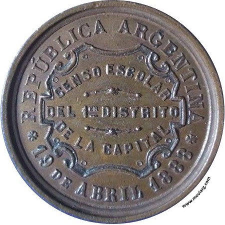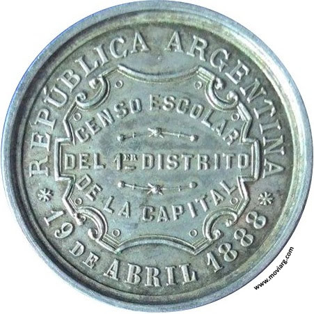 Anverso: EL CONSEJO ESCOLAR Á SUS COOPERADORES. Firma: R. GRANDE Reverso: CENSO ESCOLAR / DEL 1ER. DISTRITO / DE LA CAPITAL / REPÚBLICA ARGENTINA / 19 DE ABRIL 1888 Referencia: FERRARI-148 (RG) | |