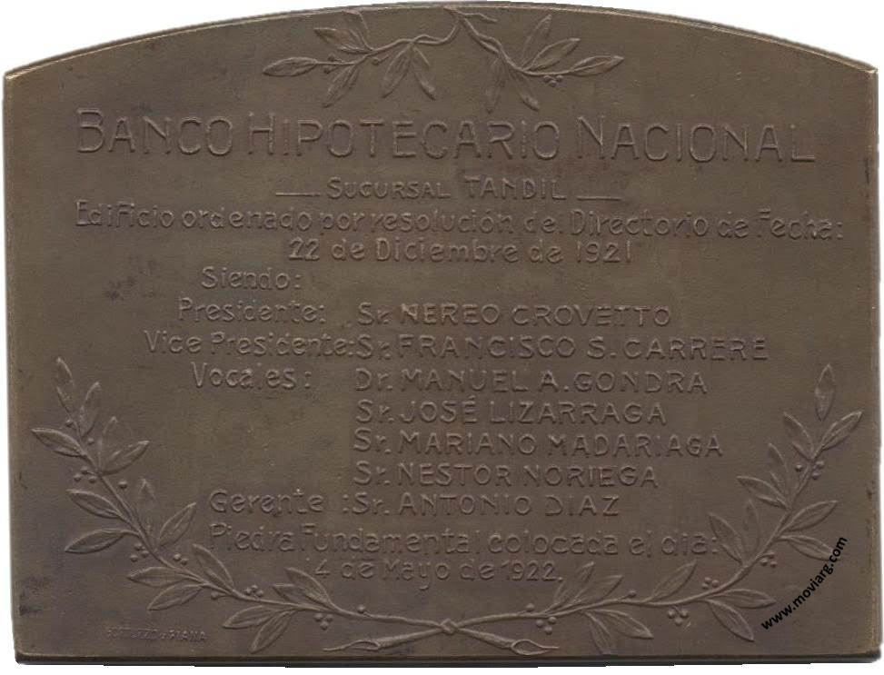 Anverso: Reverso: BANCO HIPOTECARIO NACIONAL / SUCURSAL TANDIL / EDIFICIO ORDENADO POR RESOLUCIÓN DEL DIRECTORIO DE FECHA: / 22 DE DICIEMBRE DE 1921 / SIENDO: / PRESIDENTE: SR. NEREO CROVETTO / VICE PRESIDENTE: SR. FRANCISCO S. CARRERE / VOCALES: DR. MANUEL A. GONDRA / SR. JOSÉ LIZARRAGA / SR. MARIANO MADARIAGA / SR. NESTOR NORIEGA / GERENTE: SR. ANTONIO DIAZ / PIEDRA FUNDAMENTAL COLOCADA EL DIA: / 14 DE MAYO DE 1922. Firma: GOTTUZZO Y PIANA Referencia: | |