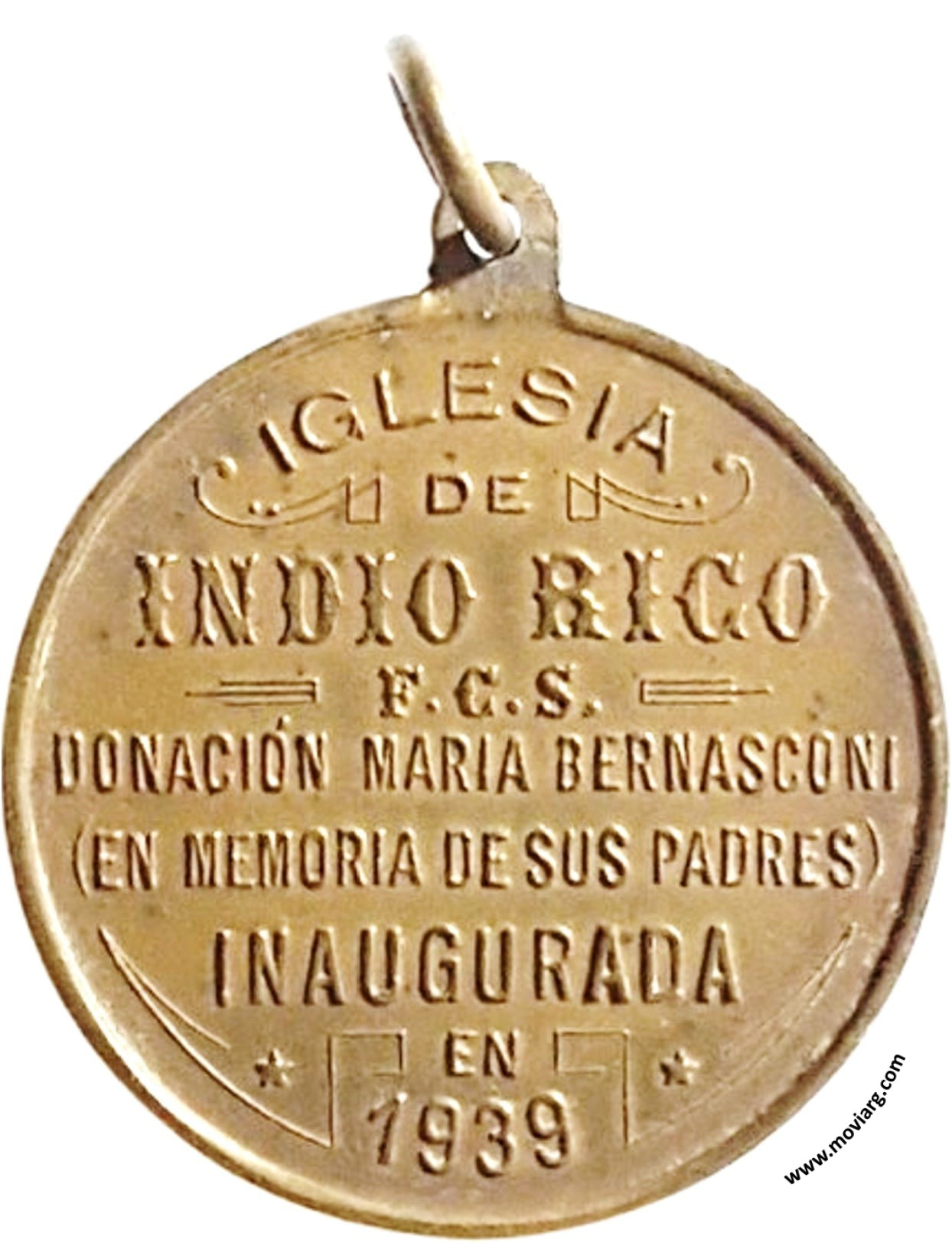 Anverso: NTRA. SRA. DEL CARMEN / RUEGA POR NOSOTROS. Firma: (???) Reverso: IGLESIA / DE / INDIO RICO / F.C.S. / DONACIÓN MARIA BERNASCONI / ( EN MEMORIA DE SUS PADRES ) / INAUGURADA / EN / 1939 Referencia: | |