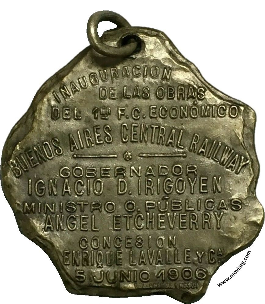 Anverso: Reverso: INAUGURACION / DE LAS OBRAS / DEL 1ER. F. C. ECONÓMICO / BUENOS AIRES CENTRAL RAILWAY / GOBERNADOR / IGNACIO D. IRIGOYEN / MINISTRO O. PÚBLICAS / ANGEL ETCHEVERRY / CONCESION / ENRIQUE LAVALLE Y CA. / 5 JUNIO 1906. Firma: BELLAGAMBA Y ROSSI Referencia: | |
